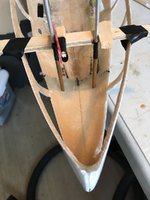 Some progress today. Started with drag shafts. Main part is 9/32 bass tube, with each descending size and 6-32 bolts. Cut little sleeves, CA-ed them together. I used E6000 for the threaded portion, will see how it works out. The nut is keeping tension on the bolt while it dries Assembled with strut Marked holes. Generally want to keep disks inside of the beam, not quite possible here Drexel with cut off disk is most used tool. Last year I switched to the big bag of disks, very good decision Holes cut, test fit with reference disk Also sized up the rudder so I could figure out rudder post placement Marked on hull where to drill Test arrangement for servo placement, probably enough room to have it forward of posts To get the post aligned, I use a longer run inside the rudder post tube to better judge alignment. Then for this case with 2 rudders I decided to just use filler to support the posts and not deal with sanding a block down right Anchors to a temp alignment piece Checking in front of screws I CA-Ed the rudder posts and drag shafts in place to make epoxying easier Taped up And fiberglassed Temp barriers for rudder posts. I will build the servo mount off of this base and will have a piece of wood that holds the top of the posts and the rudder servo to keep gears engaged . Balsa block to take up space Side view of the days progress Pretty much done with drive stuff, little things here and there left. I will probably make the rudder servo mount soon, also consider water channel and then deck. Deck will be tricky with the wing turrets, but probably a few weekends to go before I get to that point