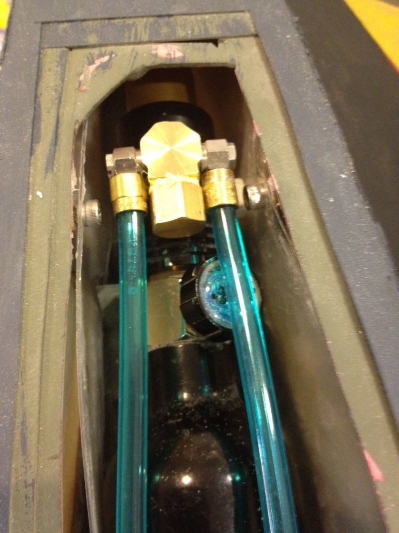 There are 3 holes on the lightweight regulator. Steve plugs one before he ships the reg. I think it might be for straight unregulated CO2. The other two holes - the big one is 1/4 npt and high flow, the small one is 1/8 npt and low flow. I put one of the 250 psi pressure relief valves in the small port, makes a convienient way to drain the system and satisfies the requirement for a manufactured pressure relief valve. Weighs under two ounces I think. Has not leaked at all in two years so far. I have extras if you want one at the mwci Nats. Otherwise plug the small port, and use the big one for supplying the cannons. Ron Hunt