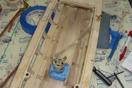 I worked on installing my pump this week. Since the water channel is fairly wide, I just used 2 pieces of 1/4 ply to get the right spacing. Overall, it was easier to mount than I was expecting. I also completed the waterproofing. I started with West Systems epoxy on the ribs and decks because I figured these would take the most abuse. Then I used spar varnish to coat everything. At this point the hull and hatches weigh in at 3 lb, 2.6 oz. I'm very happy with that weight - including all the rest of the components that I have on hand, estimated final weight is sitting at 8.0 lbs. This gives me 3 lbs left for ballast and those things I have forgotten to include.