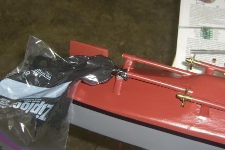 It floats!!! It doesn't have any leaks!!! Yesterday Mikey came over to my shop and helped my set up my guns and gave me a sheeting 101 class. I didn't realize that the MAV2s had an inlet and outlet and that they would leak if you hooked them up backwards. Of course I hooked them up backwards, so when I initially cracked the valve, CO2 was escaping freely. Fortunately, I had not glued the valves into the ship, so after a little re-work of the valve system everything stayed sealed. After a few minor tweeks, the guns were firing with reasonable consistency and velocity I had originally planned to sheet the sides with 2mm depron foam, but when I tested the contact cement on the foam it ate the foam. With my first combat two weeks away, I decided not to mess with figuring out the foam. Fortunately I had enough 1/32 balsa in stock from my airplane supplies to sheet the Roanoke. Attaching the sheeting went fairly quickly. The only problem I had was sanding a little too hard, so the balsa is really thin over a couple of ribs. Hopefully the silkspan will keep it all together. Once the sheeting was done I added a coat of grey for extra sealing and let it dry over night. It has some wrinkles and is a little wavy in places, but overall I'm very happy with my first sheeting job. The Roanoke now weighs in at 9 pounds, 9.8 oz with some of superstructure and a couple ounces of radio equipment missing. That means I'll have about 1 lb of ballast to work with to reach fighting weight. I took the ship out to the hot tub and it floated fine. After all this work, it is great to see it sitting there in the water. I left the ship in the water about 10 minutes and could not find any leaks. Which is actually a little surprising, since I had forgotten to put the grease in the stuffing boxes. I guess the shaft to bearing fit is tight enough to keep the water from coming in very fast. I marked the waterline and declared it a successful launch. Now to complete the fitting out.